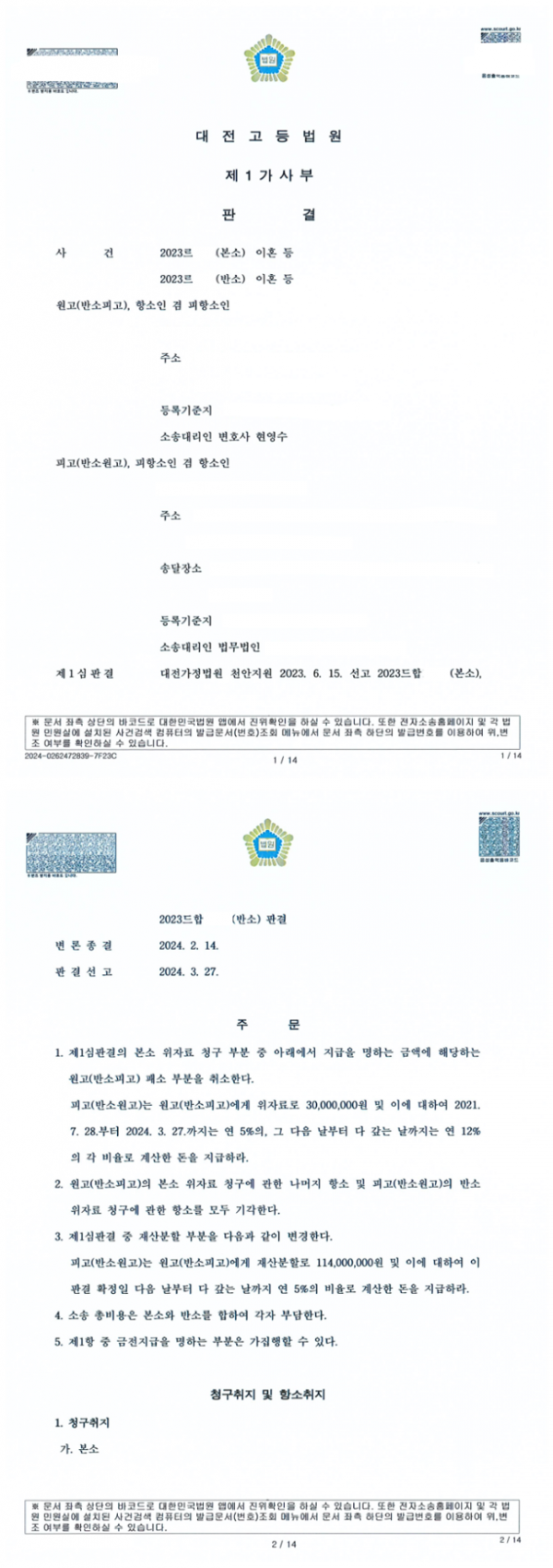 - [이혼 위자료 항소심 승소] 항소심에서 상대방의 부정행위 인정되어 위자료 승소