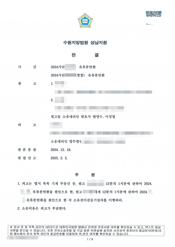 [유류분청구 전부 승소] 유류분청구 사건에서 현물 반환으로 전부 승소한 사례 의뢰인들은 상속인으로서 조카 명의로 증여된 부동산에 대하여 유류분반환 청구 소송을 제기하였습니다. 피고는 특별한 부양 내지 기여에 대한 대가라고 주장하면서 다투었지만,재판부는 피고의 주장을 받아들이지 않았습니다.재판부는 원고들이 청구한 바에 따라 현물 반환을 명하여 원고들의 청구를 모두 인용하였습니다.