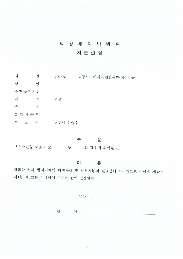 [소년재판 1호 처분] 오토바이 교통사고 1호 처분 사례 오토바이를 운전하다가 사고를 일으킨 사건인데 1호 처분을 받은 사례입니다.보호소년은 이전에도 2차례 처분을 받은 전력이 있었지만,사전에 철저히 준비하고 대응하여 최선의 결과를 얻을 수 있었습니다. 소년재판은 일반 재판과는 여러 가지 면에서 다른 특성을 가지고 있습니다. 소년재판은 비밀리에 진행되고 직권으로 심리되므로 변호사들도 경험하기가 쉽지 않습니다. 소년재판에서 좋은 결과를 얻기 위해서는 소년재판의 특성을 잘 파악하여 사전에 철저하게 준비하는 것이 중요합니다.