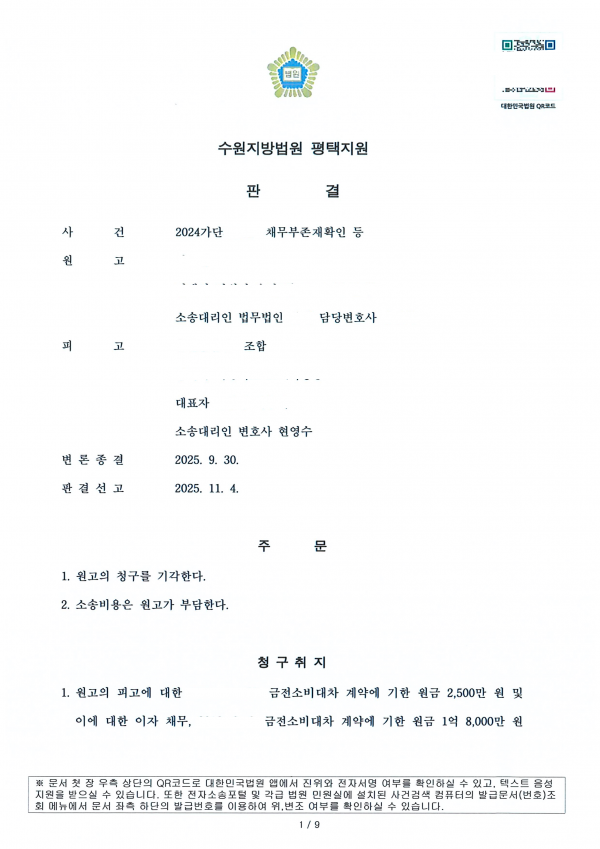 [채무부존재확인 청구 기각] 금융기관을 상대로 한 채무부존재확인 청구 기각 원고는 금융기관을 상대로 채무부존재확인 청구 소송을 제기하였습니다. 원고는 금융기관에 근무하는 원고의 자녀가 소비대차계약서를 작성한 것이고, 자신은 소비대차계약을 체결한 사실이 없다고 주장하였습니다. 코어변호사는 원고의 의사에 따라 소비대차계약이 체결되었음을 주장, 입증하였고,필적감정까지 진행한 결과 승소할 수 있었습니다.