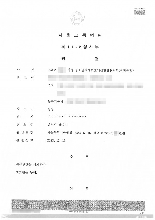 다행히 항소심은 본 변호인의 주장을 받아들여 무죄를 선고하였습니다.