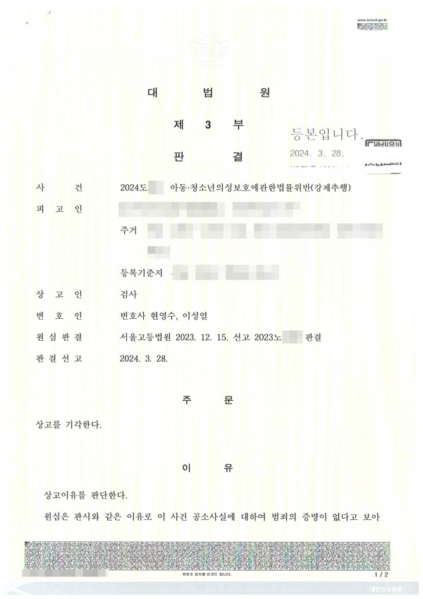 - [아동청소년 강제추행 무죄] 1심 유죄 - 항소심 무죄 - 상고심 무죄