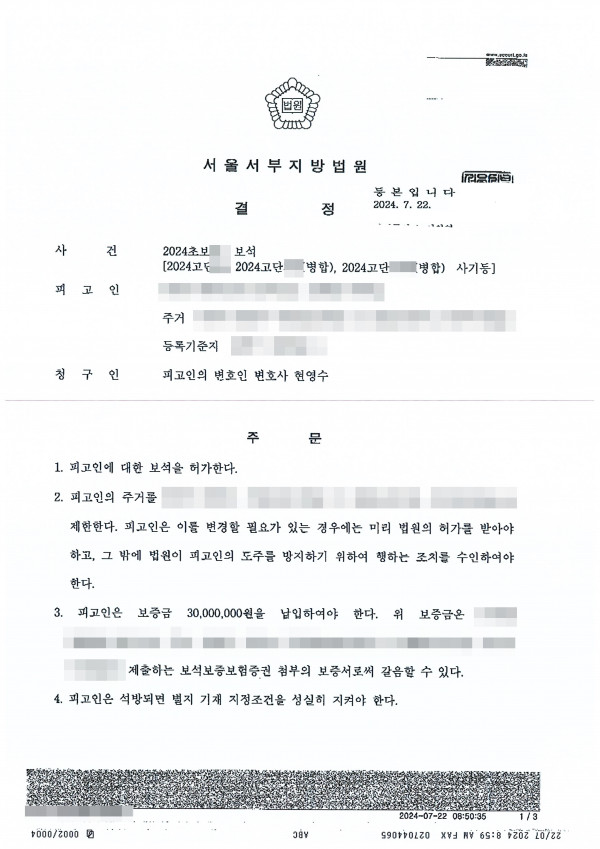 [보석 인용] 사기 등 여러 사건이 병합되었음에도 보석 인용 의뢰인은 상품권 관련 사기 사건으로 구속 기소되었고 추가 사건들이 계속 병합되었습니다. 의뢰인은 일부 무죄 주장을 하고 있었습니다. 그런데 본 변호인은 검찰 측의 추가 사건 수사와 기소 때문에 재판이 지연된다고 판단했습니다. 이에 본 변호인은 피고인에 대한 보석을 청구하였고, 법원은 피고인에 대한 보석을 허가했습니다. 통상 병합 사건으로 구속영장을 발부하여 구속 상태에서 재판을 계속하는 경우가 많은데 이 사건에서는 법원이 보석을 허가했습니다.