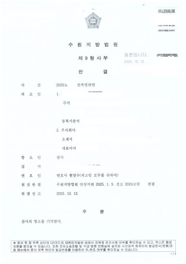 [무죄판결에 대한 검사 항소 기각] 건축법위반 1심 무죄판결에 대한 검사 항소 기각 의뢰인이 1심에서 무죄판결을 받았으나 검사가 항소한 사건입니다.1심에서도 코어변호사가 변호해서 무죄판결을 이끌어 낸 사건입니다.항소심에서도 검사가 집요하게 유죄 주장을 하였지만,1심에서의 무죄 결론이 바뀌지는 않았습니다. 1심에서 무죄판결을 받았다고 안심할 수 없습니다.대부분의 경우 검사는 1심 무죄판결에 대해서 항소를 제기하고,항소심에서 추가로 주장, 입증하여 유죄로 바뀌는 경우가 많기 때문입니다.변호사는 형사재판이 끝나서 확정될 때까지 최선을 다해야 하고,절대 긴장을 늦추면 안 됩니다.