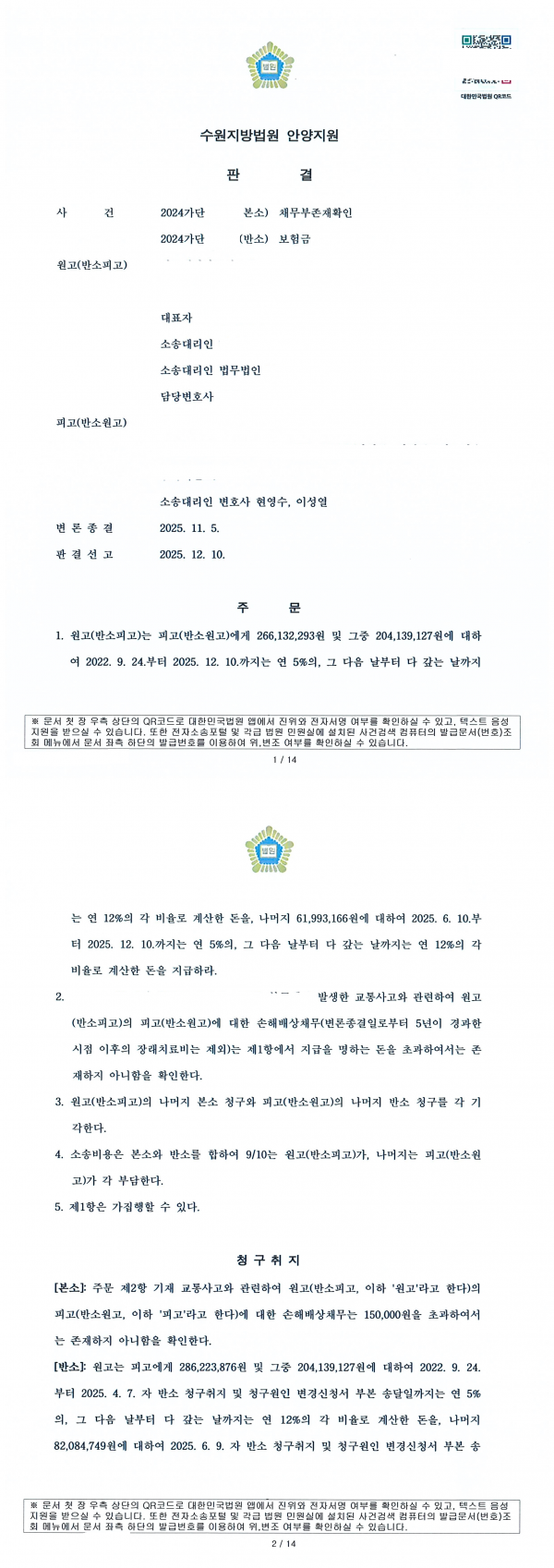 교통사고로 인한 손해배상청구 사건에서 승소한 사례입니다.