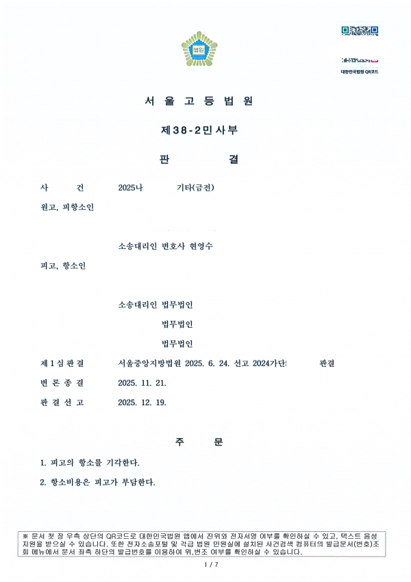 - [상대방 항소 기각] 제1심 원고 승소 판결에 대한 피고 항소 기각