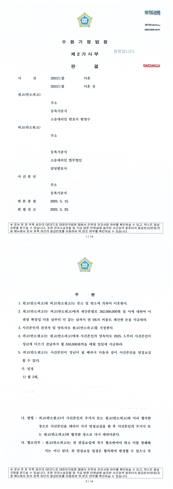 - [이혼소송 1심 확정] 친권과 양육권 확보하고 합리적인 재산분할로 확정