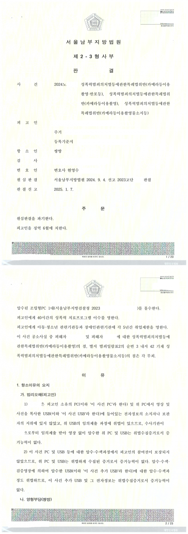 피고인은 성폭법위반(카메라등촬영)죄 등으로 1심에서 징역 2년을 선고받았습니다.