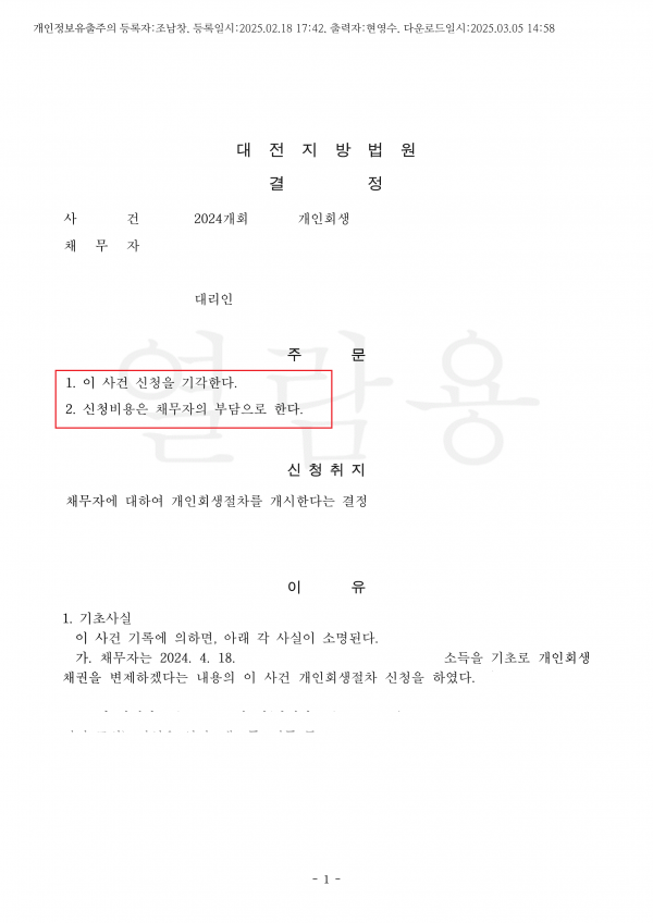 채권자의 개인회생 신청을 기각하였습니다.