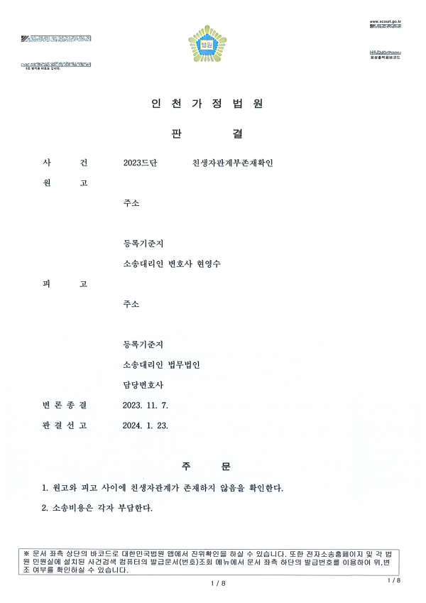 - [친생자관계부존재확인 승소] 배우자가 전혼 자녀를 의뢰인의 친생자로 신고한 사안