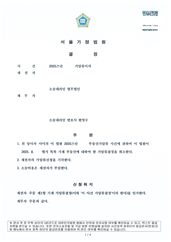 법원은 코어변호사의 주장을 받아들여 상대방의 가압류를 취소하고